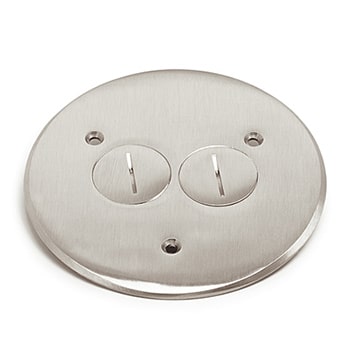 5 3⁄4″ nickel flanged floor box cover with two 1 1⁄2″ screw plugs for duplex outlet (receptacle) applications.
