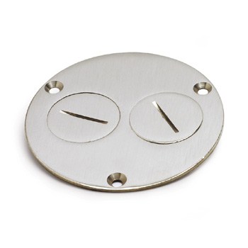 4″ round nickel floor box cover with two 1 1⁄2″ screw plugs, designed for duplex outlet (receptacle) applications.