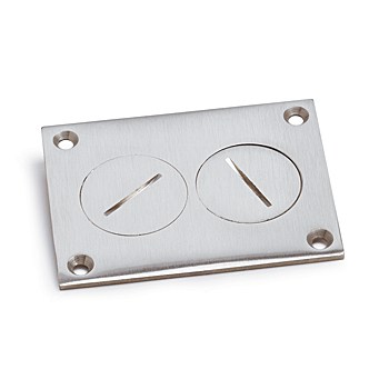 2 7⁄8″ x 3 7⁄8″ brushed aluminum floor box cover with two 1 1⁄2″ screw plugs, designed for duplex outlet (receptacle) applications.