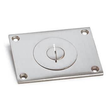 2 7⁄8″ x 3 7⁄8″ brushed aluminum floor box cover with 2″ – 1⁄2″ combo plug, designed for single outlet (receptacle) applications.