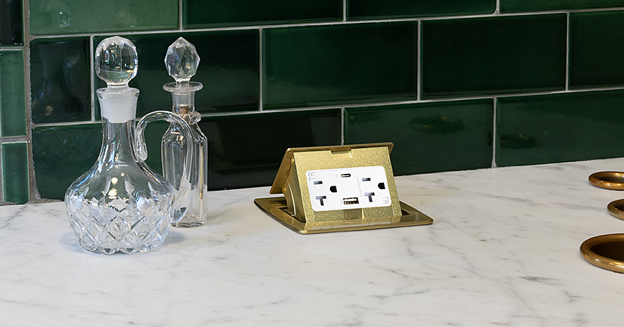 Kitchen Counter Pop-Up Power Outlet Assembly With 20A(TR) Decora/2USB(AC) Receptacle – Brass Metal Cover