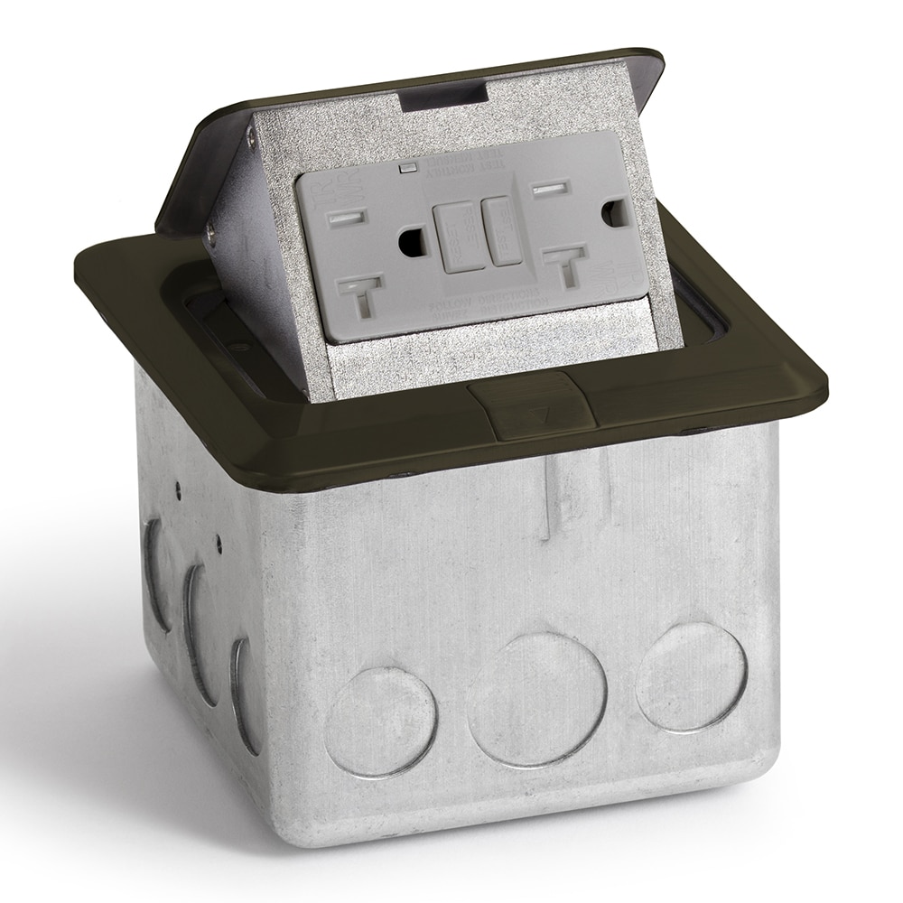 Dark bronze pop-up floor box with 20A (TR) GFCI outlet (receptacle).