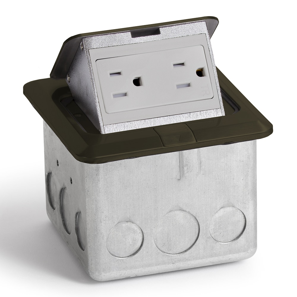 Dark bronze pop-up floor box with 15A (TR) Decora outlet (receptacle).