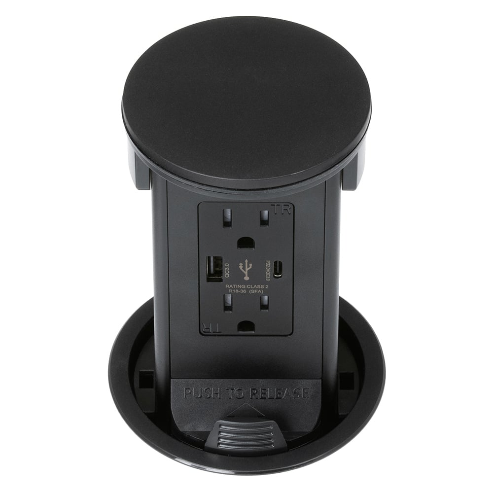 This pop-up power station includes a 15 AMP tamper-resistant (TR) receptacle also features advanced USB charging ports, including a USB-A port that supports Quick Charge 3.0 and delivers up to 27 watts, and a USB-C port that supports both QC 3.0 and PD 2.0 standards for up to 30 watts of fast charging power. The USB-C port is powerful enough to charge smartphones, tablets, and even laptops, making this outlet a complete power and charging solution for your kitchen or workspace. When both USB ports are in use, the combined output caps at 30 watts, ensuring safe and efficient power distribution.