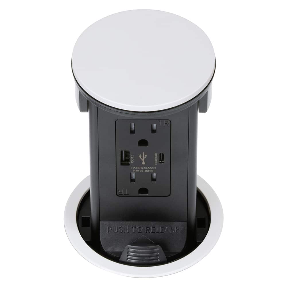 This pop-up power station includes a 15 AMP tamper-resistant (TR) receptacle also features advanced USB charging ports, including a USB-A port that supports Quick Charge 3.0 and delivers up to 27 watts, and a USB-C port that supports both QC 3.0 and PD 2.0 standards for up to 30 watts of fast charging power. The USB-C port is powerful enough to charge smartphones, tablets, and even laptops, making this outlet a complete power and charging solution for your kitchen or workspace. When both USB ports are in use, the combined output caps at 30 watts, ensuring safe and efficient power distribution.