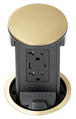 When power is needed, simply press down on the spring-loaded top and the cylindrical unit raises up. The receptacle is a 20 Amp rated duplex/2USB (A&C), and has tamper resistant (TR) plugs. The USB charging ports (1 Type A & 1 Type C) are 27W max (A) & 30W max (C) when charging individually, or total 27W max when charging simultaneously [12W max (A) & 15W max (C)].