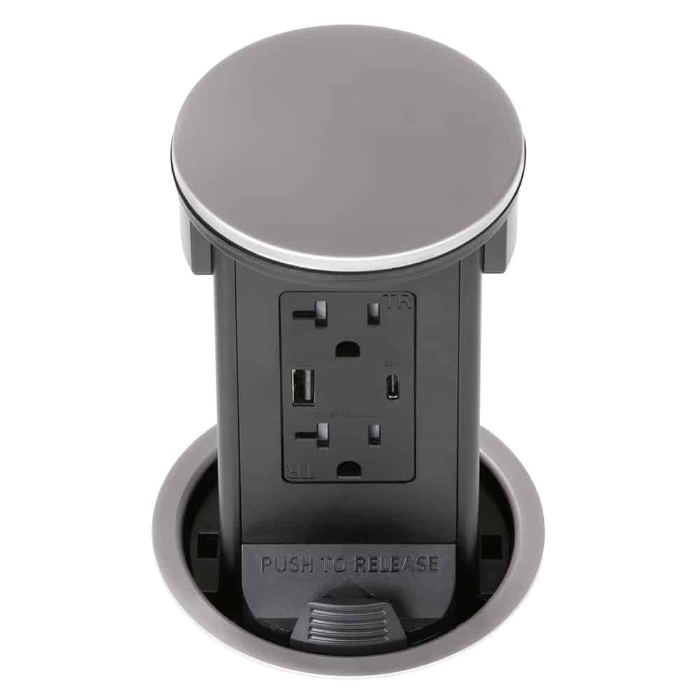 The Lew Electric PUR20ACD-SS round Kitchen Countertop Pop-Up assembly is a sleek and functional solution for bringing power access directly to your kitchen countertop or any other work surface. Designed to remain hidden when not in use, this retractable in-counter power outlet features a press-and-pull design—simply press the top and lift to reveal the outlet station. When not needed, the unit retracts and disappears completely beneath the counter, preserving a clean and clutter-free surface. The round top is constructed from real metal with a premium stainless finish, making it an ideal match for modern kitchens and bathrooms with stainless fixtures and hardware.