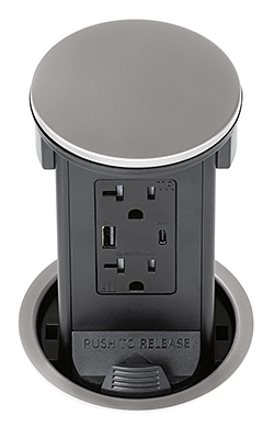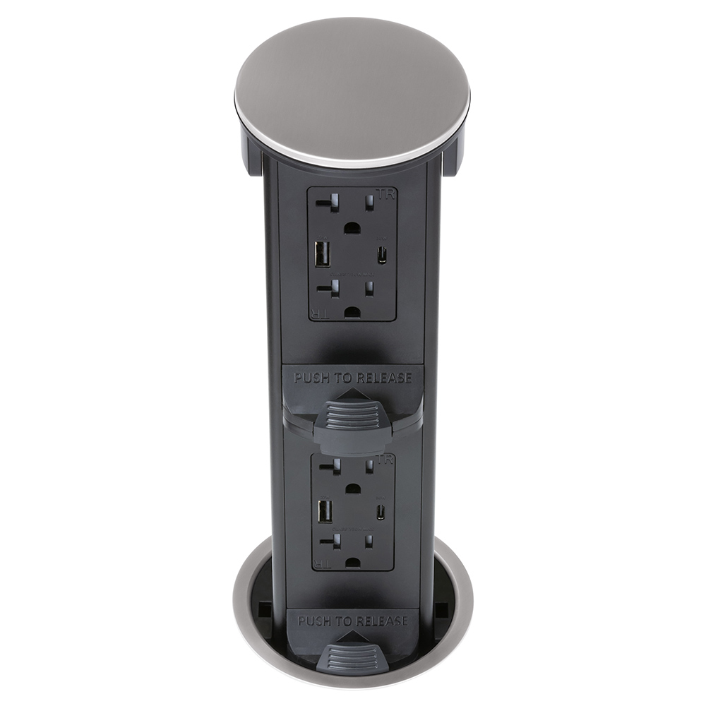 When power is needed, simply press down on the spring-loaded top and the cylindrical unit raises up. The receptacle is a 20 Amp rated duplex/2USB (A&C), and has tamper resistant (TR) plugs. The USB charging ports (1 Type A & 1 Type C) are 27W max (A) & 30W max (C) when charging individually, or total 27W max when charging simultaneously [12W max (A) & 15W max (C)].