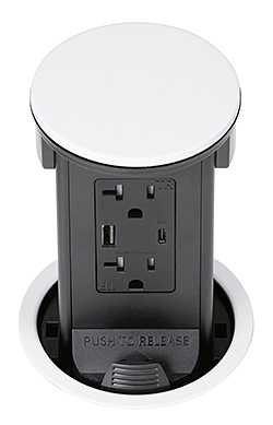 When power is needed, simply press down on the spring-loaded top and the cylindrical unit raises up. The receptacle is a 20 Amp rated duplex/2USB (A&C), and has tamper resistant (TR) plugs. The USB charging ports (1 Type A & 1 Type C) are 27W max (A) & 30W max (C) when charging individually, or total 27W max when charging simultaneously [12W max (A) & 15W max (C)].