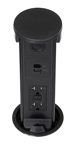 When power is needed, simply press down on the spring-loaded top and the cylindrical unit raises up. The 20 Amp rated duplex receptacle has integrated GFCI protection, has tamper resistant (TR) plugs, and is also weather resistant. The unit also contains two separate USB charging ports (1 Type A & 1 Type C) both 30W and one Bluetooth speaker (3W).