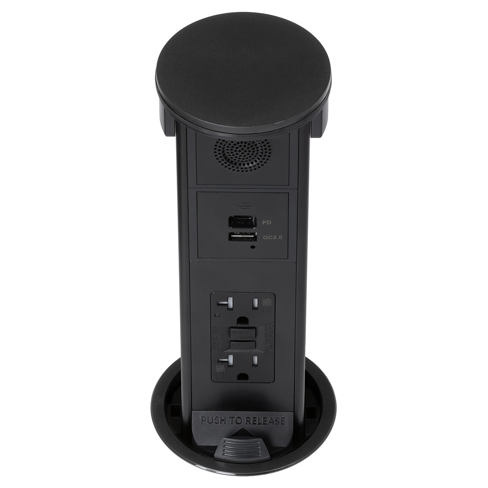 Wireless Charging Top, Round Kitchen Countertop Pop-Up Power Assembly With 20A(TR) GFCI Receptacle, Dedicated USB(A/C) Charging Ports and Bluetooth Speaker- Black Resin Cover