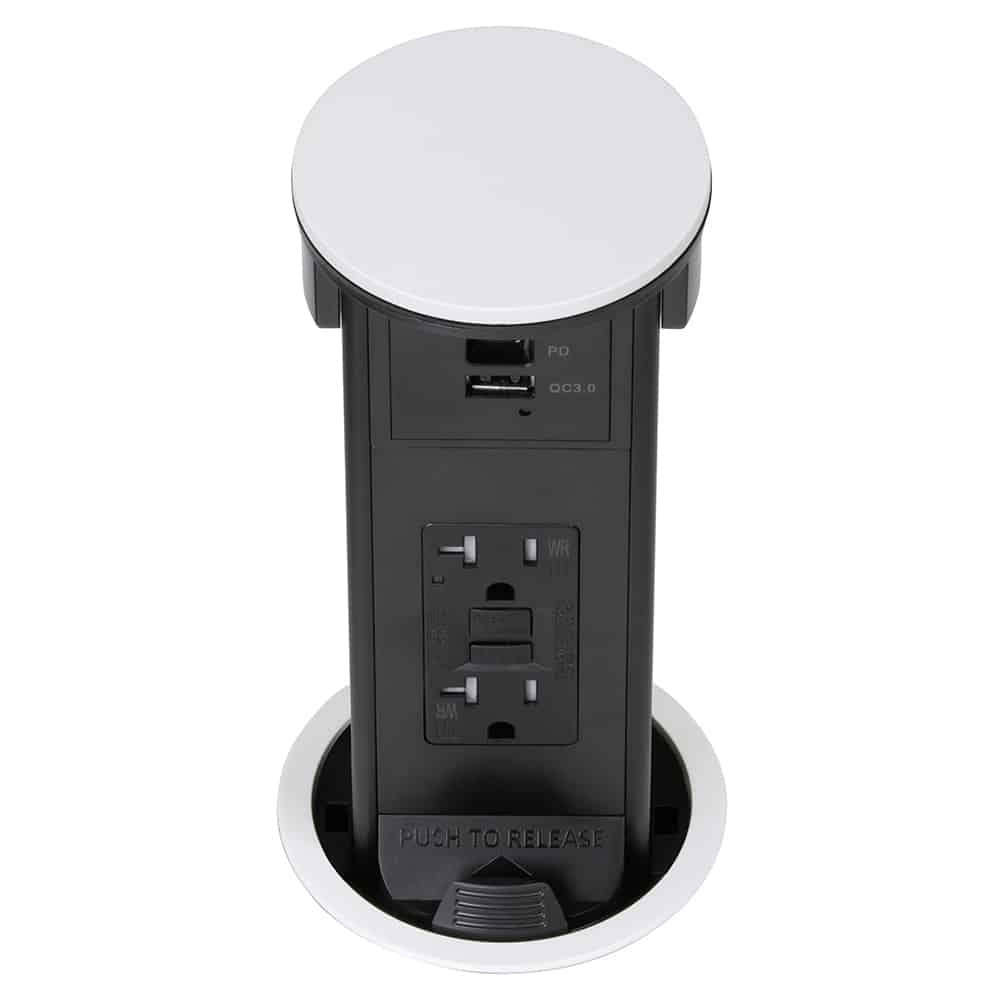 The Lew Electric PUR20GACQD-RWT Round Kitchen Countertop Pop-Up assembly is a cutting-edge power and charging solution that combines premium design, modern functionality, and advanced safety features into a compact, retractable unit. Perfect for kitchens, workstations, bars, and commercial spaces, this in-counter outlet includes a built-in 20 AMP GFCI outlet and USB-A and USB-C fast charging ports. The pop up also features a built-in white plastic, Qi wireless charging top, allowing you to conveniently charge your smartphone by simply placing it on the surface. This wireless charging station is compatible with all Qi-enabled smartphones, including popular brands like Apple, Samsung and Google. Whether the outlet is in the open or closed position, the Qi charger remains fully functional, offering seamless integration into your daily kitchen routine without cluttering your countertops.