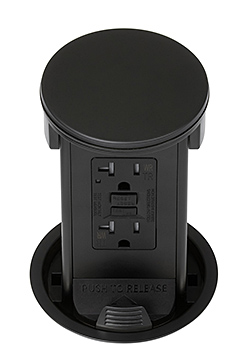 The Lew Electric PUR20GD-BK [Matte Black Metal Cover] countertop pop up power assembly is designed to be hidden in a kitchen countertop or any other indoor surface where it is not possible or convenient to have a wall outlet. When in the closed position the components are hidden under the counter.