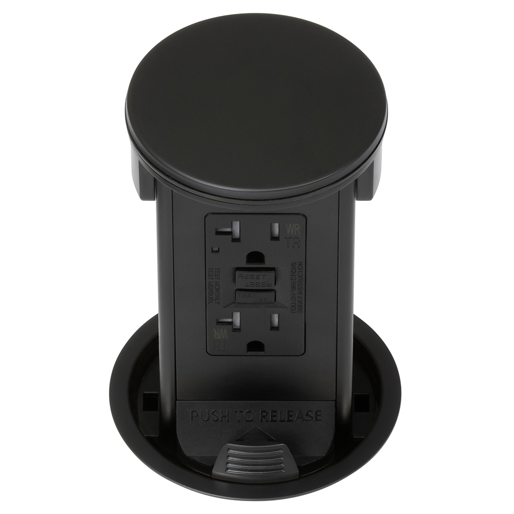Round Kitchen Countertop Pop-Up Power Assembly With 20A(TR) GFCI Receptacle- Black Metal Cover