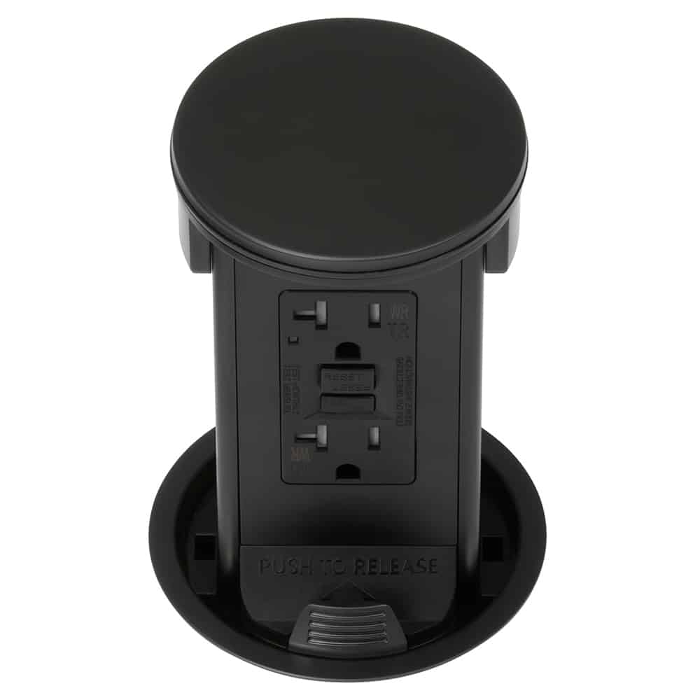 Round kitchen countertop pop-up power assembly with 20A (TR) GFCI outlet (receptacle) – black metal cover.