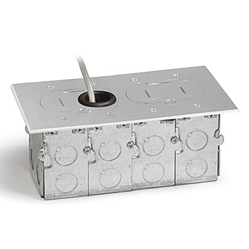 Inside the floor box are two UL listed,15 AMP (TR) duplex receptacles. A Lew RRP-2-PQ quad port Comm./Data device is also included to replace one of the receptacles if warranted. This allows for line voltage and Comm./Data to be utilized in the same box. The RCFB-2-A is a watertight assembly with its water tight screw plugs and durable 1/16″ neoprene gaskets that go under the flip lids. A second neoprene gasket goes between the cover and the finished floor, preventing water from accessing the box below. The UL listed, stamped steel box is designed for subfloor installation and the 1/2″ ko’s on all sides of the box makes cable entry easy and convenient.