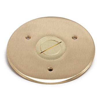 5 3⁄4″ brass flanged floor box cover with a 2″ – 1″ combo plug for Comm./Data or single outlet (receptacle) applications.