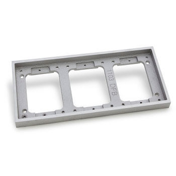 Three gang brushed aluminum tile frame for 1100 Series floor boxes.