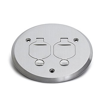 Round, plastic, drop in floor box with brushed aluminum dual flip lid cover