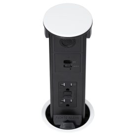 Round Kitchen Countertop Pop-Up Power Assembly With 20A(TR) GFCI Receptacle, Dedicated USB(A/C) Charging Ports and Bluetooth Speaker- White Metal Cover