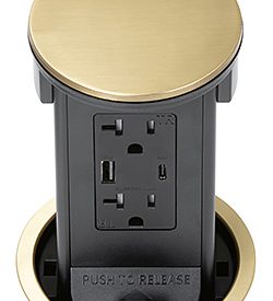 Round Kitchen Countertop Pop-Up Power Assembly With 20A(TR) Decora/2USB(A/C) Receptacle- Brass Metal Cover