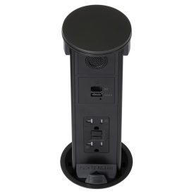 Round Kitchen Countertop Pop-Up Power Assembly With 20A(TR) GFCI Receptacle, Dedicated USB(A/C) Charging Ports and Bluetooth Speaker- Black Metal Cover