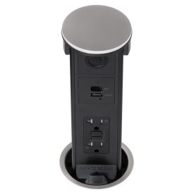Round Kitchen Countertop Pop-Up Power Assembly With 20A(TR) GFCI Receptacle, Dedicated USB(A/C) Charging Ports and Bluetooth Speaker- Stainless Metal Cover