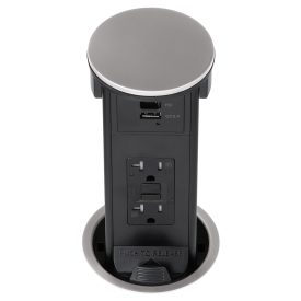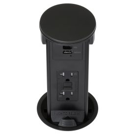 Round Kitchen Countertop Pop-Up Power Assembly With 20A(TR) GFCI Receptacle and Dedicated USB(A/C) Charging Ports- Black Metal Cover